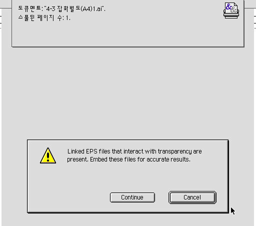 "링크된 EPS 파일이 Transparency(투명)가 적용되어 있습니다. 정확한 결과를 위해서는 이 파일에 대해 Embed를 시키세요.'