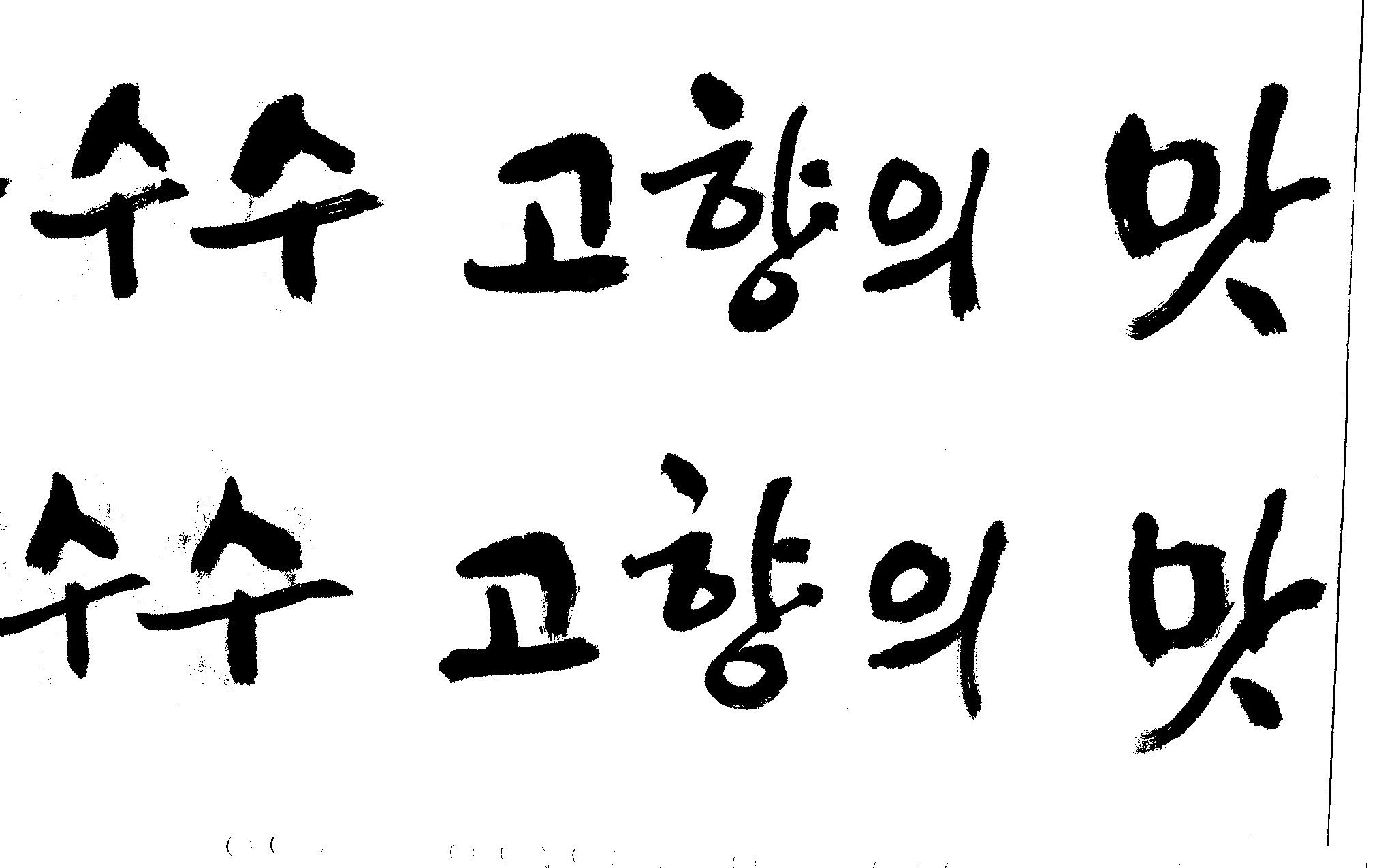 캘리고수님.. 캘리 부탁드립니다. 김철호 일반 1 12980 2008.10.31 15:45 > > > > > 강원도 > > 찰옥수수 > > 고향의 맛 > > > > 이상의 문구 입니다. > > 캘리 고수님들 시간되시면 도움 부탁드립니다.. > > > > 유용하게 쓰시길 , 스캔이 깨끗하지 못해서 수고 좀 하셔야 겠네요.. > "맛"이 라는 글자가 잘 않나와서 따로 올립니다. >