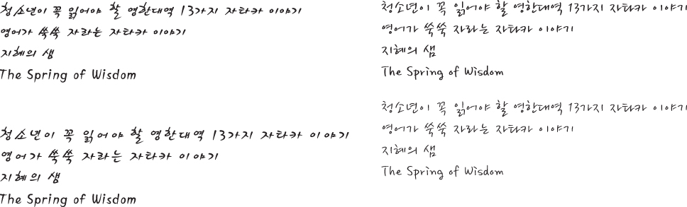 세종소주체, 봄날체로 좀 부탁드려용~~ Voyager 일반 0 3833 2009.01.19 19:00 -0001.11.30 00:00 vo.ai (0byte) + 31 > > 청소년이 꼭 읽어야 할 영한대역 13가지 자타카 이야기 > 영어가 쑥쑥 자라는 자타카 이야기 > 지혜의 샘 > The Spring of Wisdom > > 부탁드려용~~ >